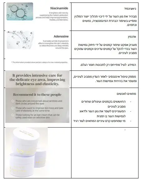 אדנוסין – מרכיב שהוכח כמסייע במניעת קמטים. בזכות היכולת הייחודית לחדור את תא העור, הוא מסייע בשיקום העור והענקת מראה צעיר וזוהר.